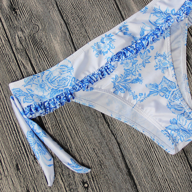 Criss Cross free- adjustable back tie Halter Top Detailed Ruffle with boho vibes Seamless and Sexy Cheeky Bottoms with a Low Cut Rise Soft Blue, Floral, Printed Design